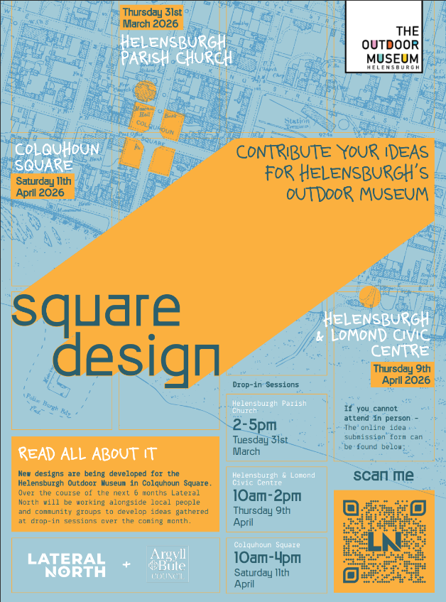 New designs are being developed for the Helensburgh Outdoor Museum in Colquhoun Square. Over the course of the next 6 months Lateral North will be working alongside local people and community groups to develop ideas gathered at drop-in sessions over the coming month.